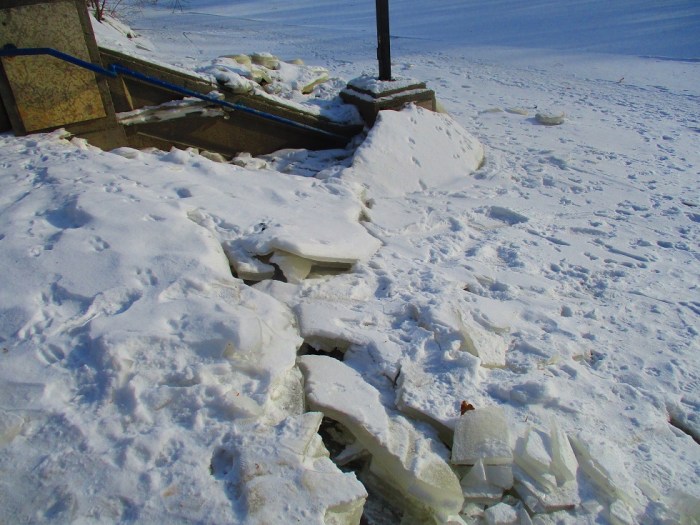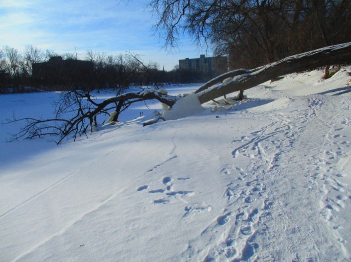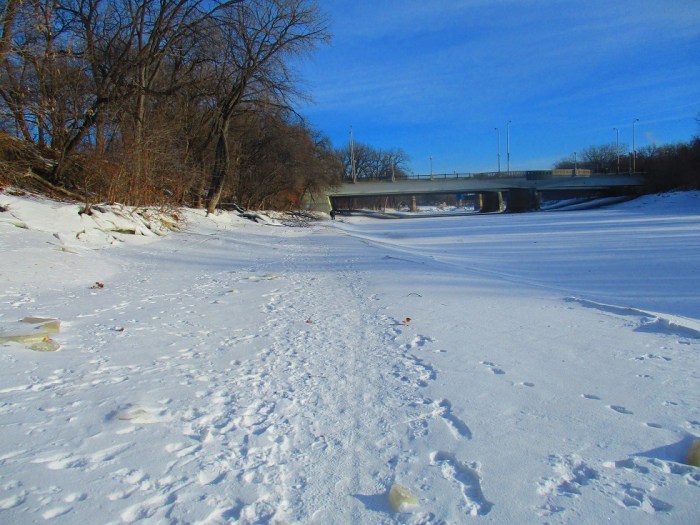 The Assiniboine River in Winnipeg walking trail is above the water/ice for the first time since August. The trail is marred by fallen trees from an ice storm in October. There is also big slabs of ice everywhere.