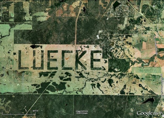 Jimmie Luecke was a young Texas state trooper who left the highway patrol in 1980 to try his luck in the oil business. He was lucky enough to do so during the chalk oil boom, became a millionaire, and invested most of his profits in land outside the town of Smithville. He started raising cattle on it, and by the late 1990’s his heard had gotten so large that he needed to clear up some more of his land of trees for grazing. Only he didn’t just settle for bulldozing all the trees, he decided to write his name in the process, thus creating the world’s largest signature.