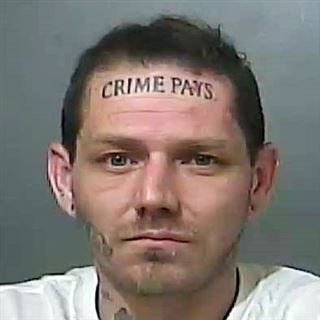 An Indiana man with a “CRIME PAYS” tattoo etched across his forehead is headed back to jail after leading officers on a pursuit.