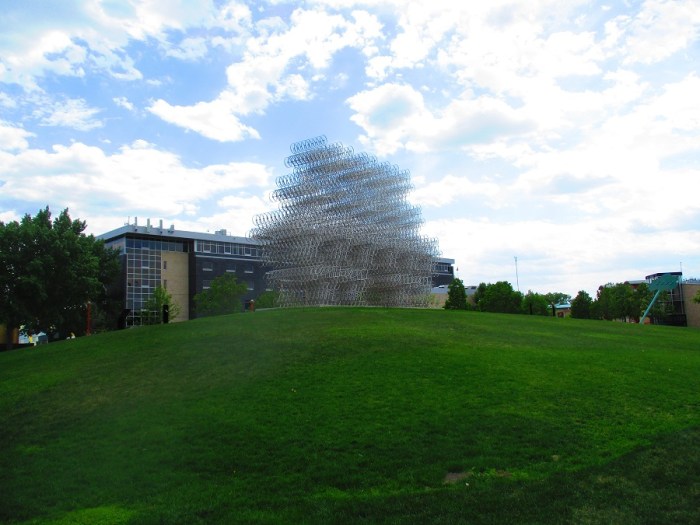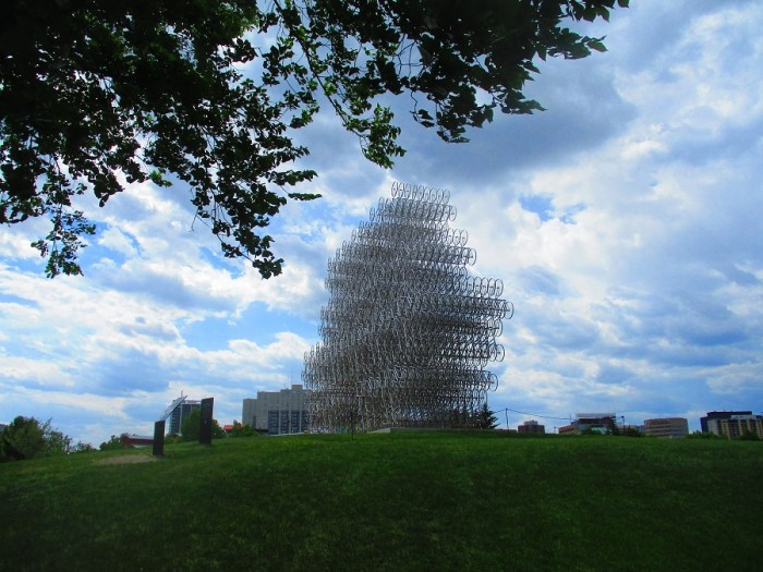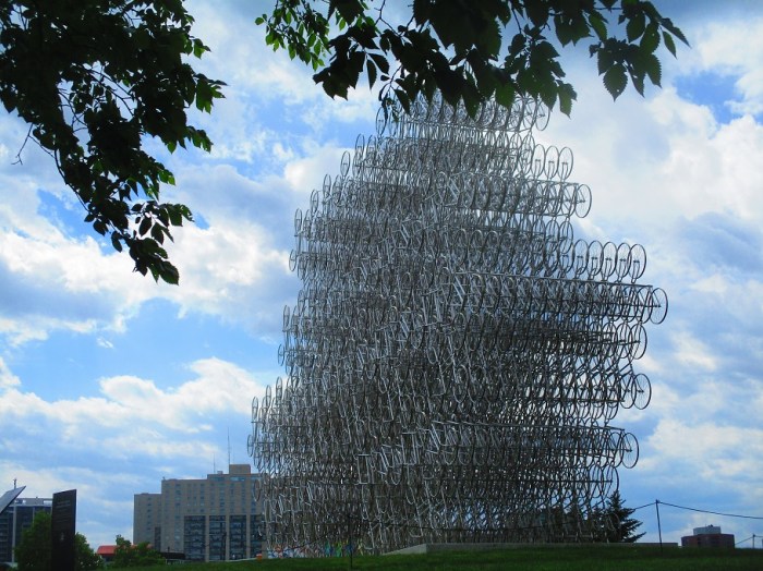 A very interesting piece of art at the Forks in Winnipeg. The piece is made up of bicycles. The Forks is a recreation and commercial area in the center of the city. It is located at the confluence of the Assiniboine River and Red River.