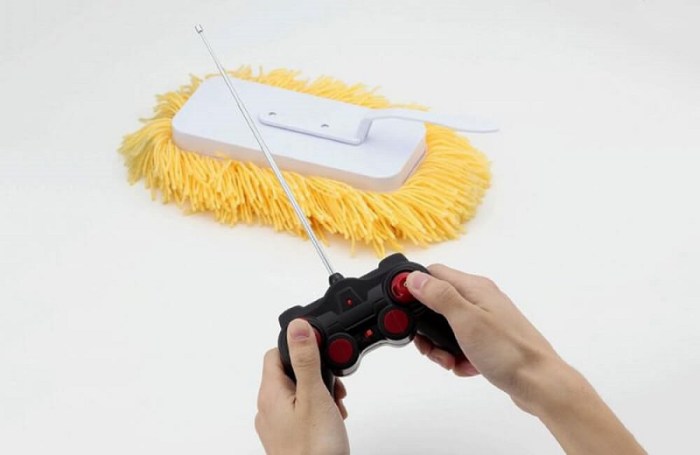 The Japanese company Kyosho makes this, and it advertises this remote-control mop as a way to “mop without mopping.” The remote-control mop is somewhat of a Roomba, but, instead of a vacuum, it is a small floor mop. The remote-control in question is a video game console.