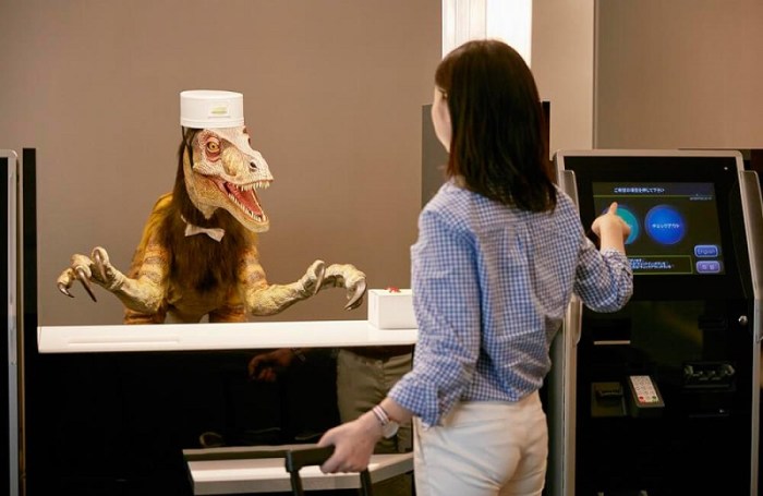 What it is: Several benevolent, loud robotic dinosaurs that check-in people at a hotel