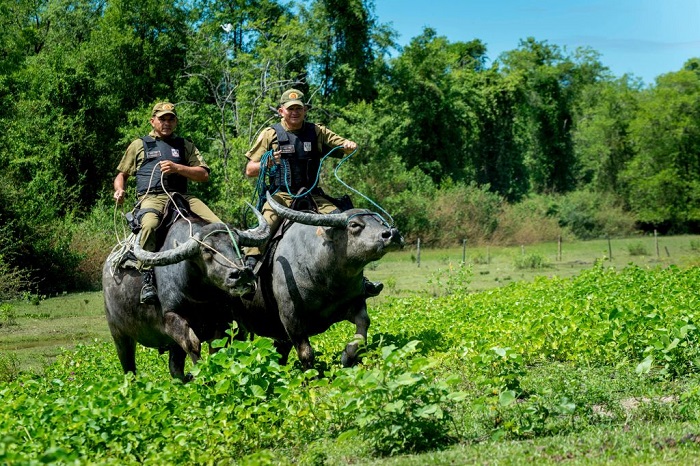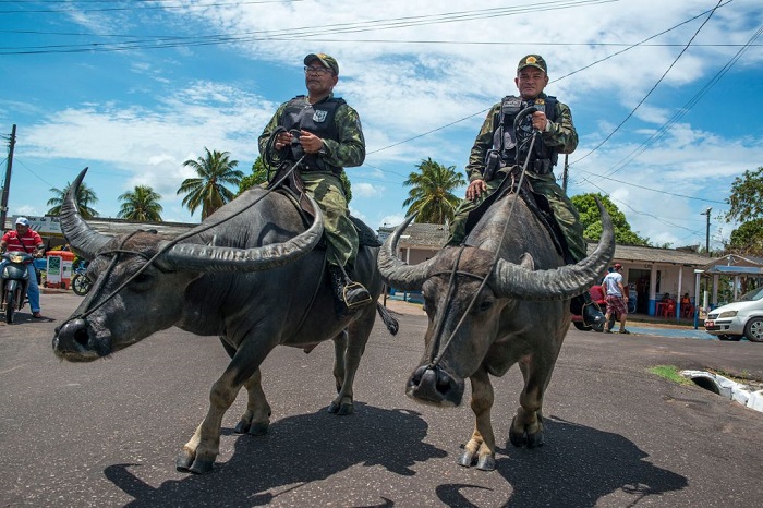 Military Police riding buffalo on the island of Marajo in Brazil.