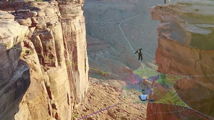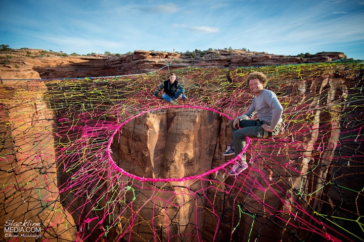 The Moab Monkeys, a Utah-based group of athletes, have no issues with vertigo or adrenaline. They recently set up a spider web net over a canyon near Moab, Utah at a head-spinning height of 400 ft to relax and BASE jump. The hand-woven, pentagonal web is 200ft. away from the nearest cliff.
