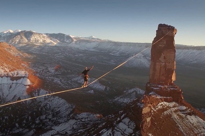 Moab Monkeys is a group that specializes in slacklining, highlining, BASE jumping and filmmaking. They have performed their stunts in places like Rio and the Austrian Alps. However it’s no coincidence that their hometown is Moab – a town in Southern Utah famous for its Mars-like landscape with canyons, cliffs and arches.