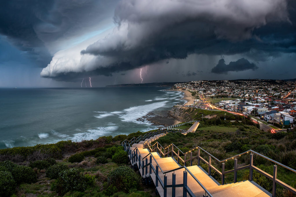 A shelf cloud is a low, horizontal, wedge-shaped arcus cloud. A shelf cloud is attached to the base of the parent cloud, which is usually a thunderstorm cumulonimbus, but could form on any type of convective clouds. Rising cloud motion can often be seen in the leading (outer) part of the shelf cloud, while the underside often appears turbulent and wind-torn. Cool, sinking air from a storm cloud’s downdraft spreads out across the land surface, with the leading edge called a gust front. This outflow cuts under warm air being drawn into the storm’s updraft. As the lower and cooler air lifts the warm moist air, its water condenses, creating a cloud which often rolls with the different winds above and below (wind shear).