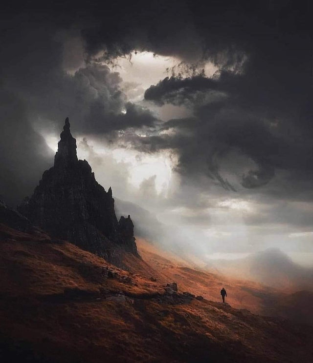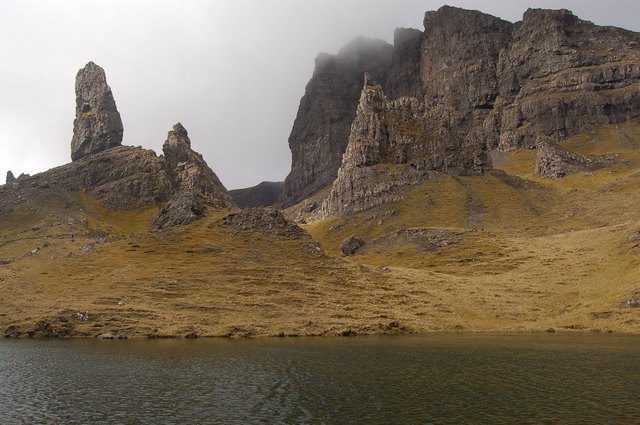 View Over Old Man Of Storr, Isle Of Skye, Scotland. During a beautiful sunrise and dramatic sky with a local shower here and there. The Old Man of Storr looms over Portree, Isle of Skye and is situated 7 miles north of the town. It is dominated by the 50 metre high petrified lava pinnacle of the Old Man of Storr, with a brutal tumble of cliff behind, and the panorama spreads across loch, sea and islands to the high mountains of the mainland beyond.