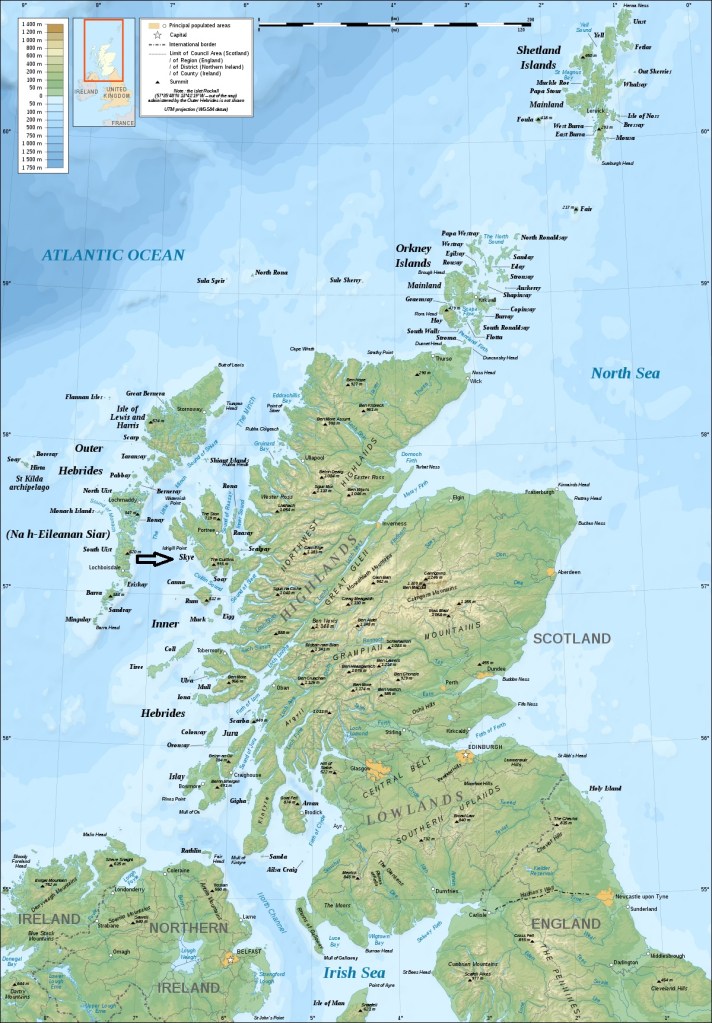 The Isle of Skye, or simply Skye, is the largest and northernmost of the major islands in the Inner Hebrides of Scotland. The island’s peninsulas radiate from a mountainous hub dominated by the Cuillin, the rocky slopes of which provide some of the most dramatic mountain scenery in the country. Although it has been suggested that Sgitheanach describes a winged shape there is no definitive agreement as to the name’s origins.