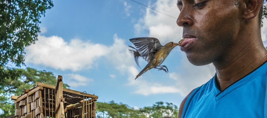 Before the coronavirus pandemic, people came to trade, sell, or watch birds at places like this in Havana, where onlookers gathered to watch a songbird take seeds from a handler’s tongue.