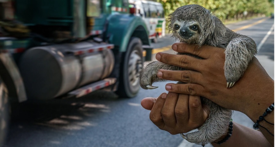 A man offers a baby three-toed sloth for sale to passersby on a highway in Altos de Polonia, in northwestern Colombia. The town is one of several hot spots in the region for the illegal sloth trade. (From “A notorious sloth cartel kingpin vanished—We tried to find him,” January 11, 2022.)