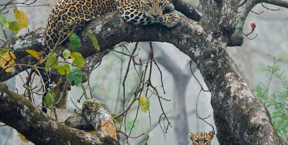 Leopards court in a flowering coral tree on a misty winter morning in southern India’s Nagarahole Tiger Reserve. Anti-poaching measures have helped increase prey populations in the park, which allows both big cat species to thrive.