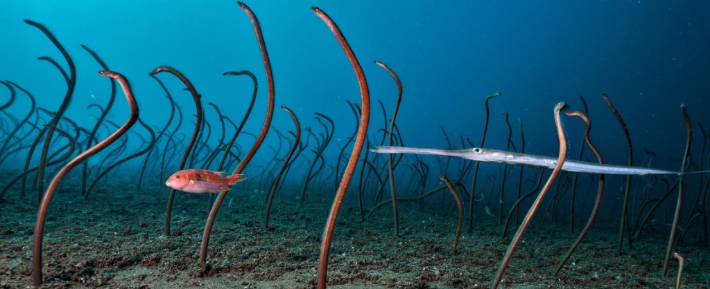 A two-spot wrasse and a cornetfish swim through a colony of garden eels about two-thirds the size of a football field on a sandy slope near Negros Island, Philippines. Social but shy, they vanish into their holes when disturbed.