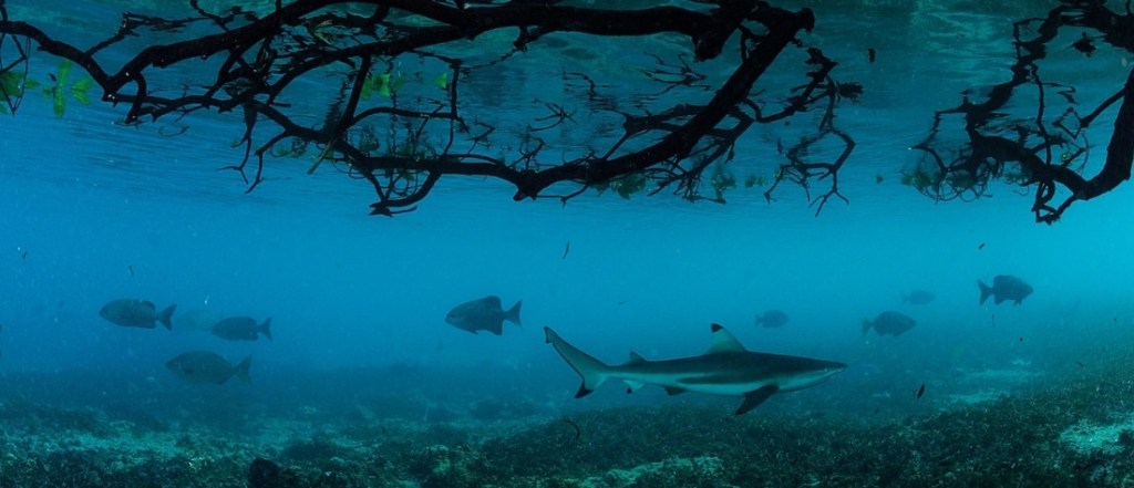 A blacktip reef shark traverses a mangrove forest of Aldabra Atoll in the Seychelles, which serves as both a nursery and hunting ground for many marine species. The island hosts one of the healthiest inshore shark populations in the Indian Ocean.
