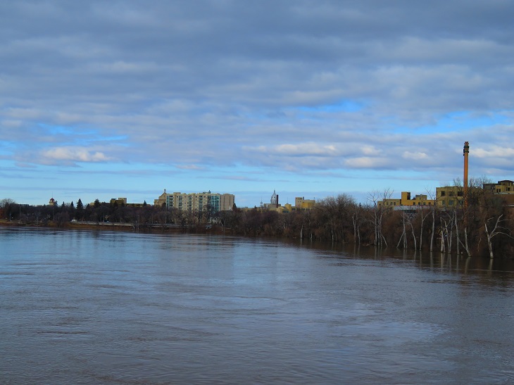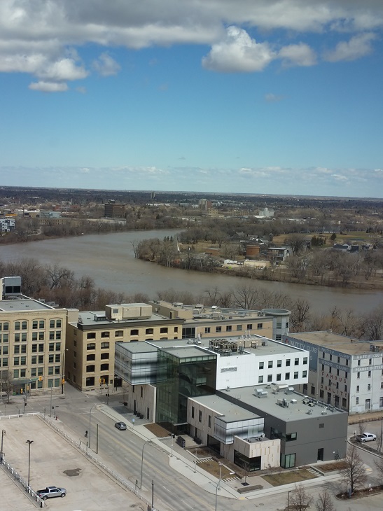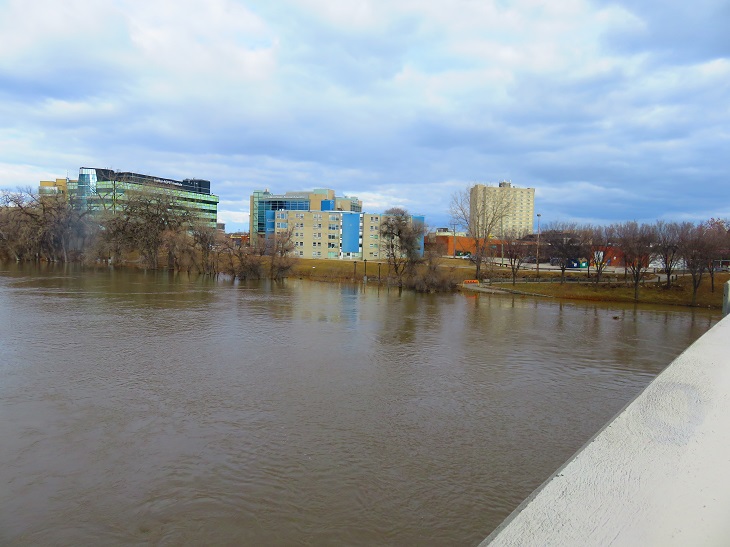 As per every spring the Red and Assiniboine rivers in Winnipeg are swollen. Both rivers are about 10 feet above normal levels. It is a moderate to light flood level.