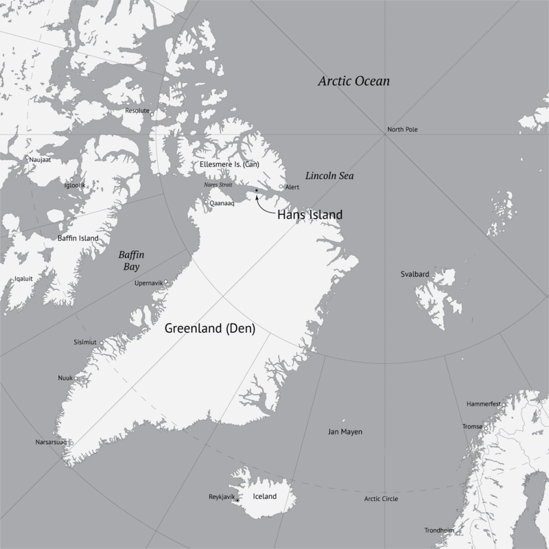 Hans Island is in the middle of the Kennedy Channel between Greenland and Ellesmere Island. A theoretical line in the middle of the strait goes through the island. Canada and Denmark could not come to terms on Hans Island in 1973 when a border treaty was signed, leaving a gap in its border description.