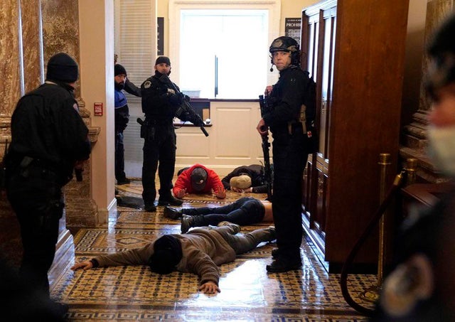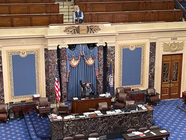 U.S. Capitol building 2021 with politicians hiding from the vandals.