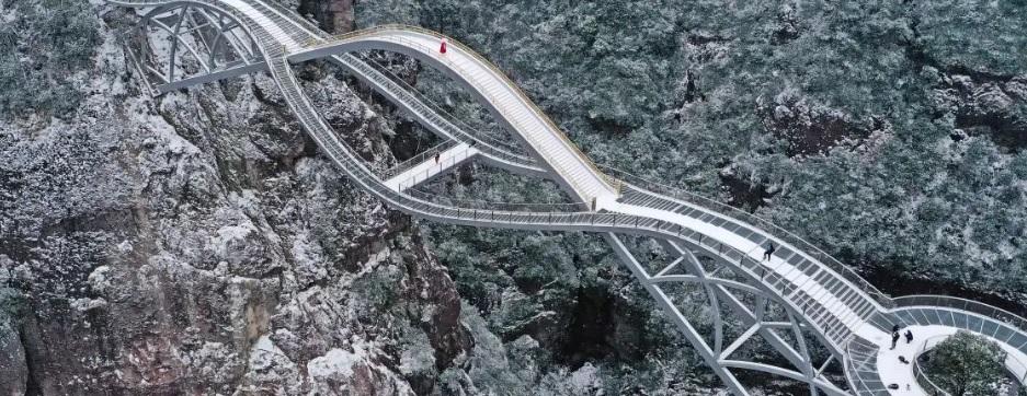 According to the official Weibo account for the Shenxianju Scenic Area, construction on the Ruyi bridge began in 2017 and was finally opened in September of 2020. In a second post, the park explained that the bridge spans 100 meters across the east and west gorges of Shenxianju. A rough translation of the post read: With a total length of 100 meters and a vertical height of more than 140 meters, it spans the east and west gorges of Shenxianju. Intertwined into an undulating bridge body, visitors have a sense of experience when they pass. The rigid and soft shape is perfectly integrated with the natural scenery of the Fairy House, just like a jade ruyi in the sky, and like a fairy draped silk. The painting is like a screen, and when seen from a distance, the mountains are full of movement, and they also carry beauty and auspiciousness.