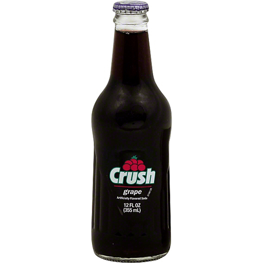 A 12oz Crush strawberry soda Crush Apple Crush Banana Crush Berry Blast Crush Berry Punch Crush Berry Pomegranate Crush Birch Beer (Newfoundland, also available at some Sobeys grocery chains across Canada) Crush Blue Raspberry Crush Bubblegum (Slush only) Crush Cherry (2009–) Crush Chocolate Crush Cola (Kuwait, 1970s–1990s) Crush Cream Soda (Canada and UK); sold clear in Québec, and Newfoundland and Labrador; sold pink in the rest of Canada Crush Frozen Orange Dream Crush Tropical Punch Crush Fruity Red Crush Ginger Beer Crush Grapefruit Crush Grape Crush Lemon Crush Lemonade Crush Lemon-Lime Crush Lime Crush Lime Rickey Crush Nectar Crush Orange Crush Orange Dry Crush Peach Crush Peach Sour Crush Pear Crush Pineapple (Originally sold only in Newfoundland) Crush Pink Grapefruit Crush Red Cream Crush Red Licorice Crush Root Beer Crush Sarsi Crush Soda Water (Kuwait, 1970s–1990s) Crush Sour Apple (briefly offered in 2005) Crush Spruce Beer Crush Strawberries ‘n’ Cream Crush Strawberry Crush Strawberry Lemonade Crush Tuti-Fruti Crush Wild Cherry Cola Crush Watermelon Diet Crush Apple Diet Crush Cream Soda Diet Crush Grape Diet Crush Lime Orange Crush Light (in Chile) Diet Crush Orange
