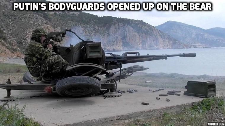 Putin was swimming in a river on the Kamchatka peninsula when a huge grizzly jumped in the water.