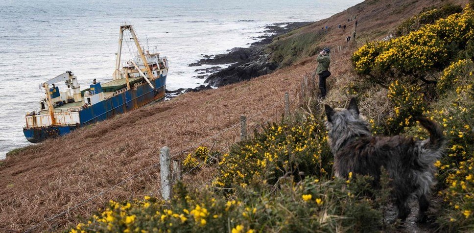 …And vertical: The ship stands tall in the water, looking like a ship that is about to slip under the waves