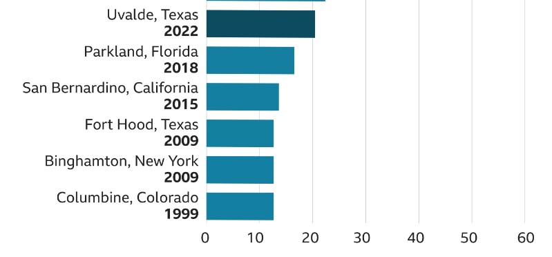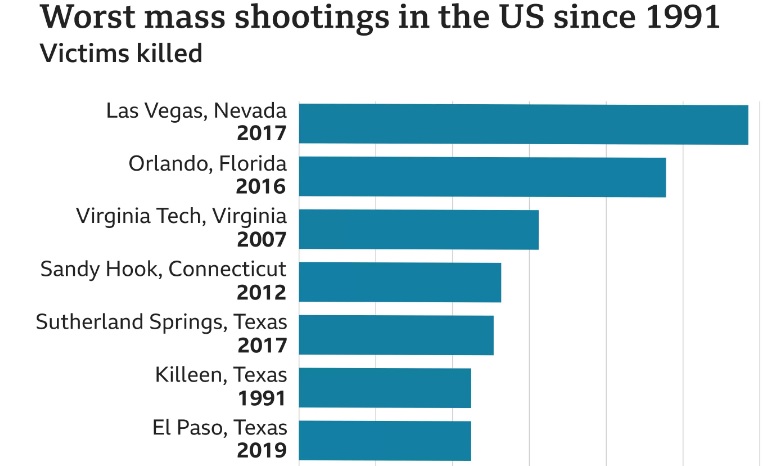 The deadliest such attack, in Las Vegas in 2017, killed more than 50 people and left 500 wounded. The vast majority of mass shootings, however, leave fewer than 30 people dead.