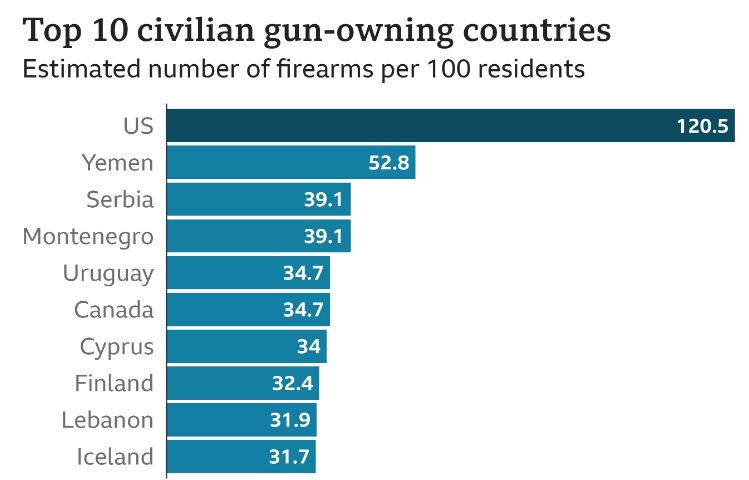 The US ratio of 120.5 firearms per 100 residents, up from 88 per 100 in 2011, far surpasses that of other countries around the world.