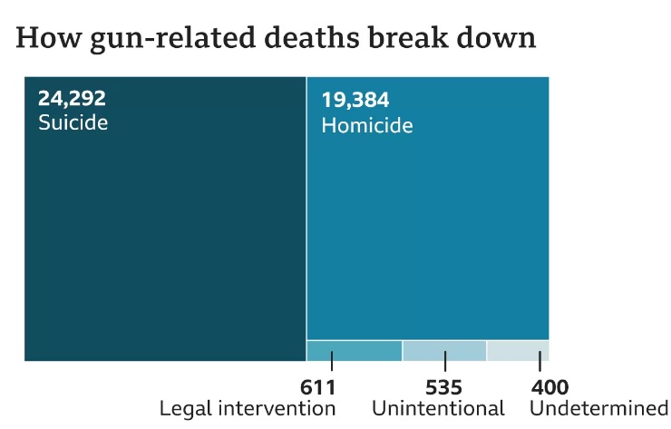 And while mass shooting and gun murders generally garner more media attention, of the total, 54% – about 24,300 deaths – were suicides.